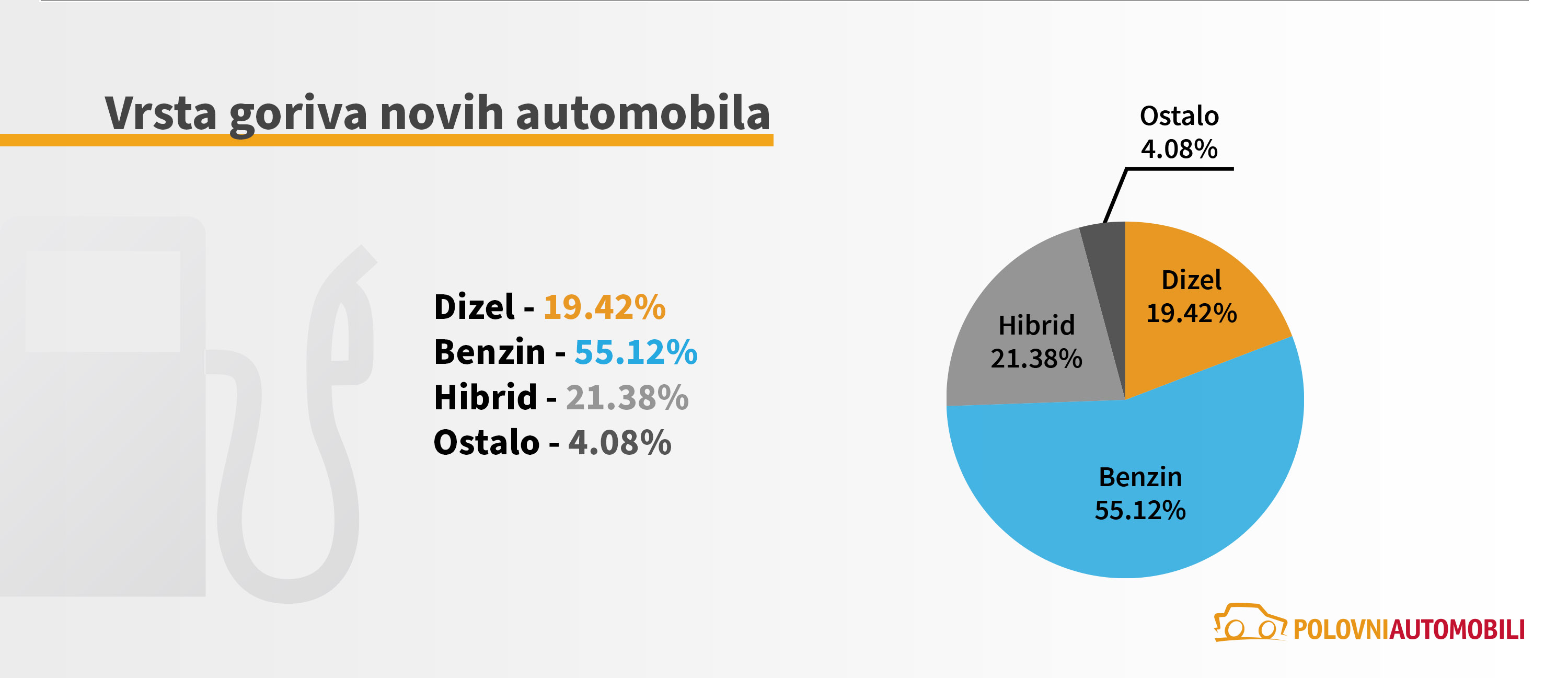 Dok je kod prodaje polovnjaka dominantan pogon na dizel gorivo, kod novih automobila je situacija znatno drugačija. U prvoj polovini ove godine više od polovine svih prodatih novih vozila je na benzin, dok dizelaši čine svega 19,42% tržišta. Interesantno je da i dalje raste popularnost hibrida, čija je prodaja skočila na 21.38% svih prodatih novih automobila. Podsećanja radi, vozila na hibridni pogon su u 2022. godini činila oko 17% kompletnog tržišta.