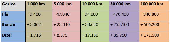U tabeli ispod vidimo koliko novca potrošimo na gorivo na pređenih 1.000, 5.000, pa sve do 100.000 kilometara.